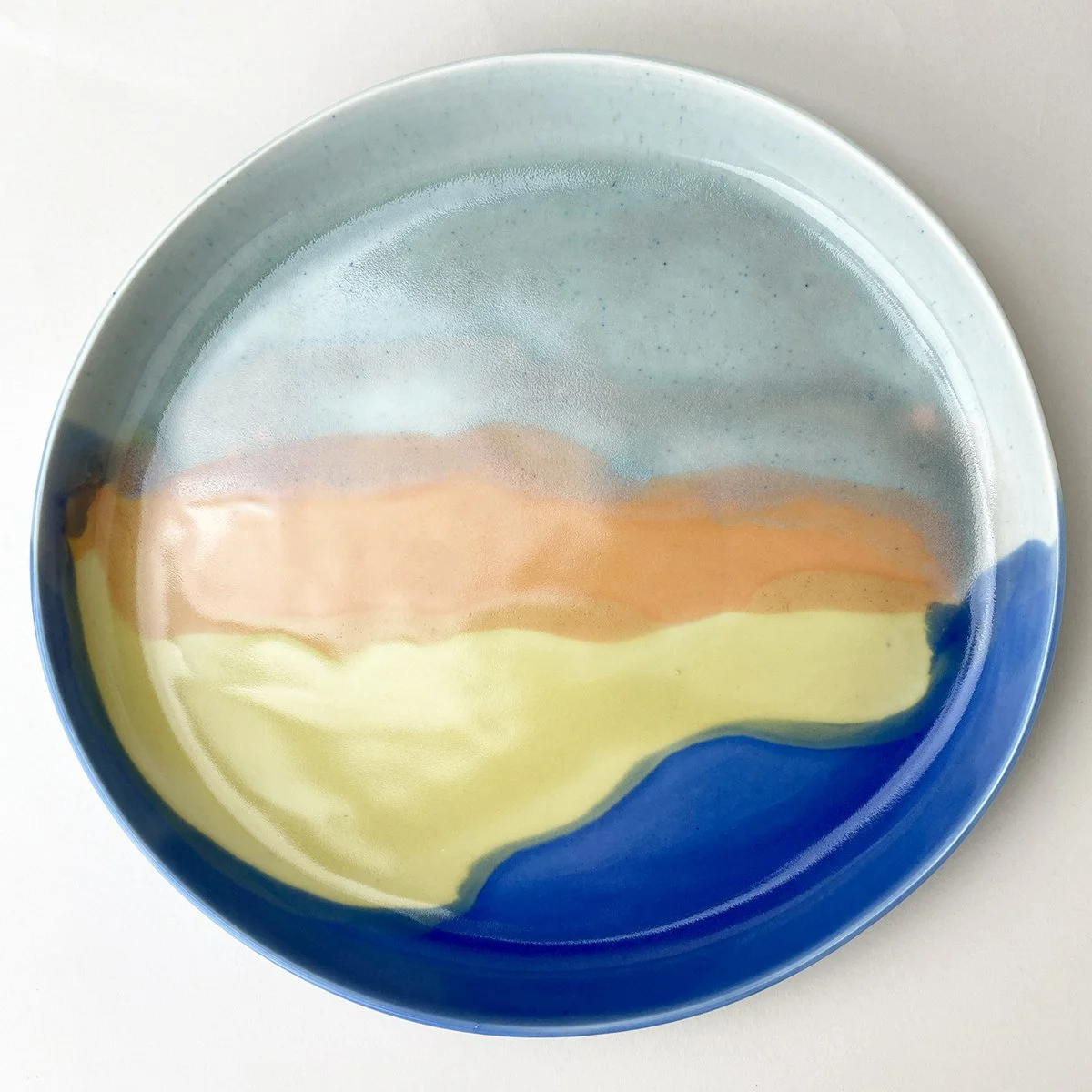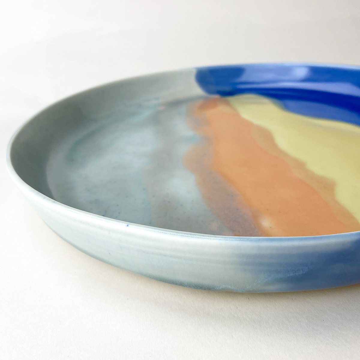 English porcelain glazed in vivid sunset hues, the platter can be used for serving roasted veggies, fish, and meats. Inspired by ocean waves touched by the setting sun experienced on a favorite beach.